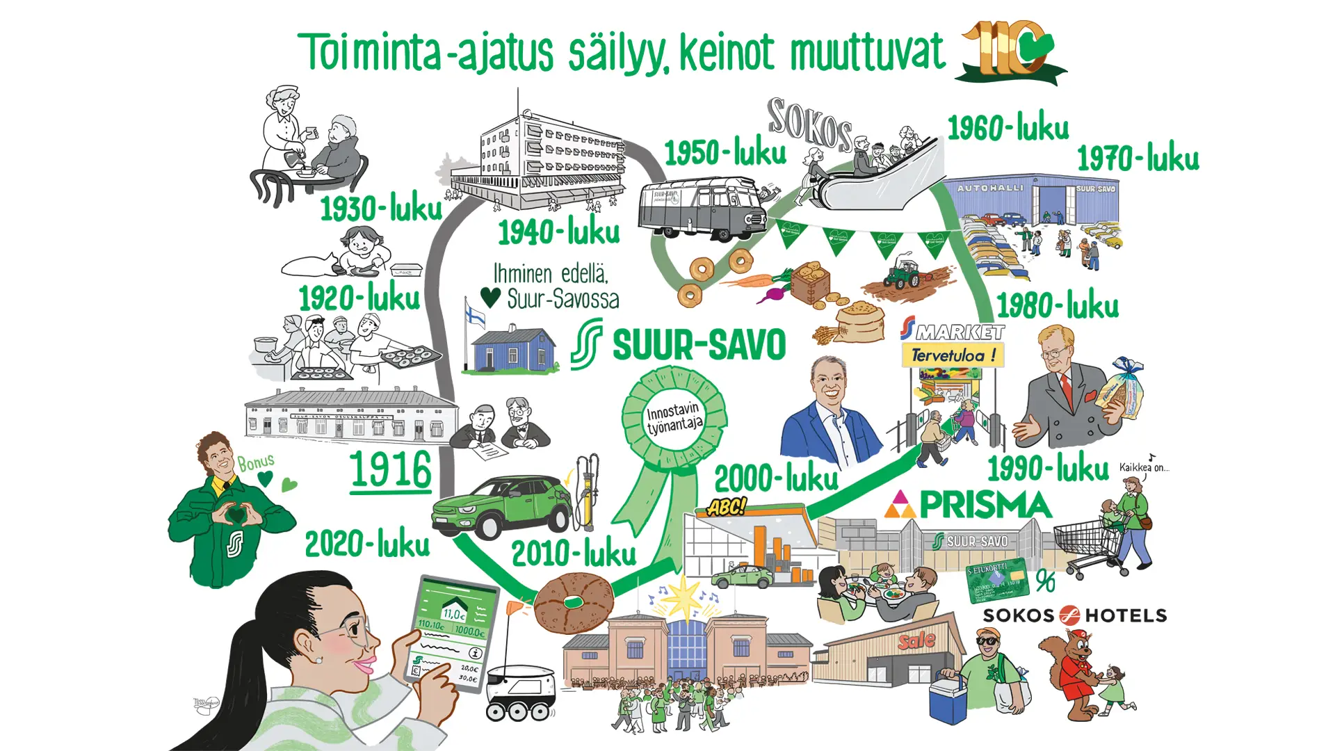 Tussitaikureiden ratkaisuna syntyi rikas ja yksityiskohtainen kuvitus, joka toimii aikamatkana läpi Suur-Savon historian. Visuaalinen viestintä mahdollisti sen, että saimme mahdutettua yhteen kuvaan kaiken 1910-luvun leipomoista ja 1950-luvun myymäläautoista aina 2020-luvun sähköautojen latauspisteisiin ja kuljetusrobotteihin. Monimutkaisen asian selkeyttäminen visuaaliseen muotoon auttaa katsojaa hahmottamaan suuret linjat yhdellä silmäyksellä. Historiakuva toimii erinomaisena työkaluna niin sisäisessä viestinnässä kuin osana juhlavuoden markkinointia, muistuttaen siitä, että sydän on edelleen vahvasti Suur-Savossa.