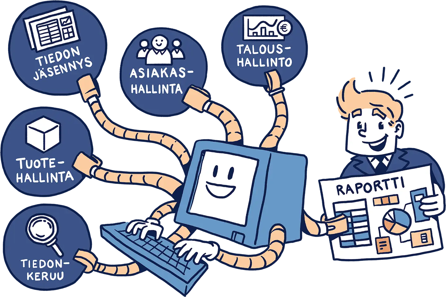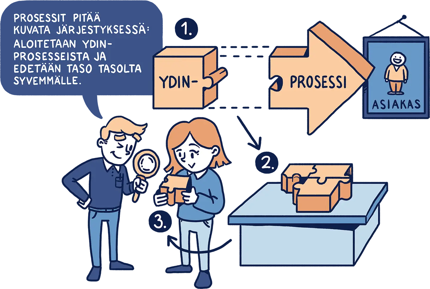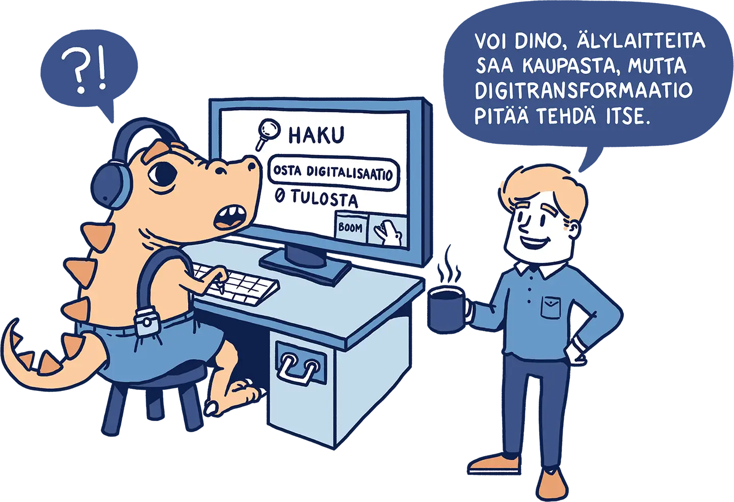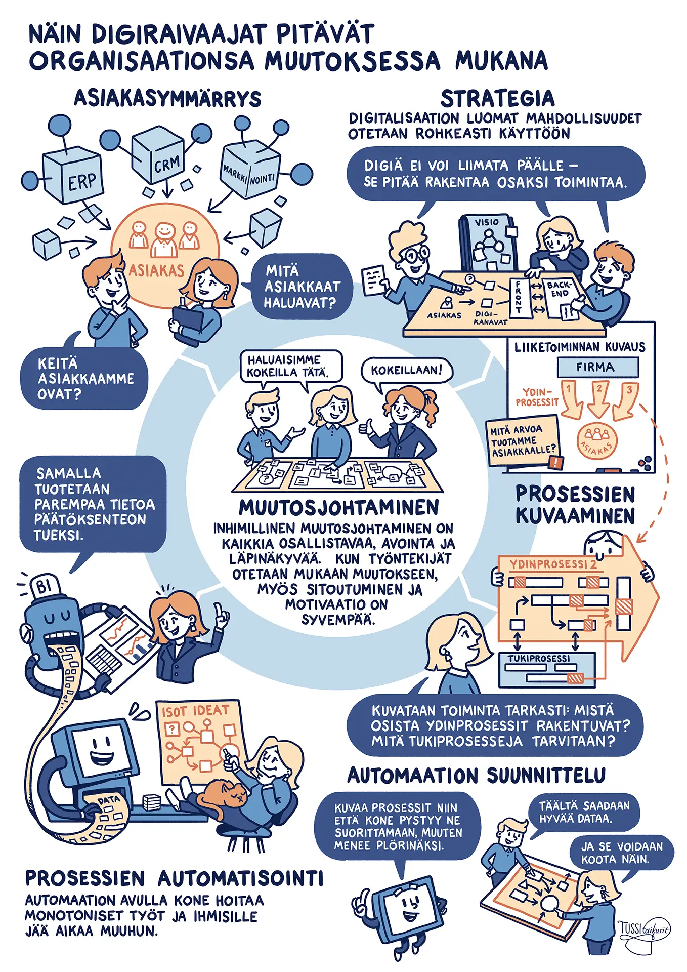 Tussitaikureiden ratkaisuna oli visualisoida oppaan keskeiset teemat oivaltaviksi ja helposti sulatettaviksi kuvituksiksi. Loimme sarjan kuvia, jotka toimivat visuaalisina tiivistelminä muun muassa prosessien tunnistamisesta, automaation suunnittelusta ja siitä, miten “digiä ei voi vain liimata päälle”, vaan se on rakennettava osaksi toimintaa. Kuvituksissa käytetty huumori ja selkeät metaforat auttavat lukijaa hahmottamaan kokonaiskuvan nopeasti.