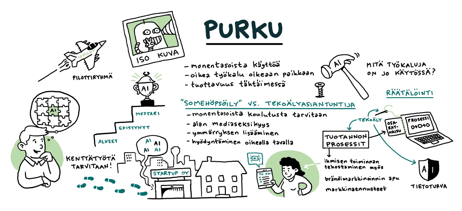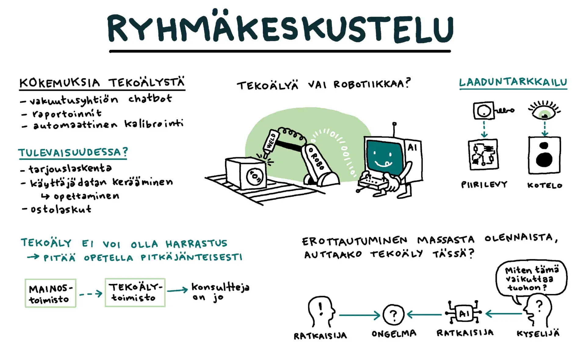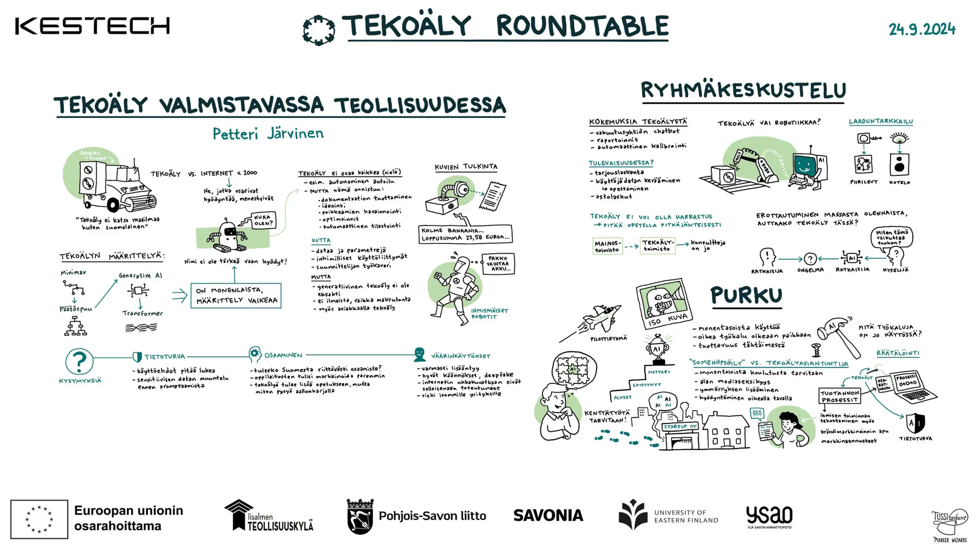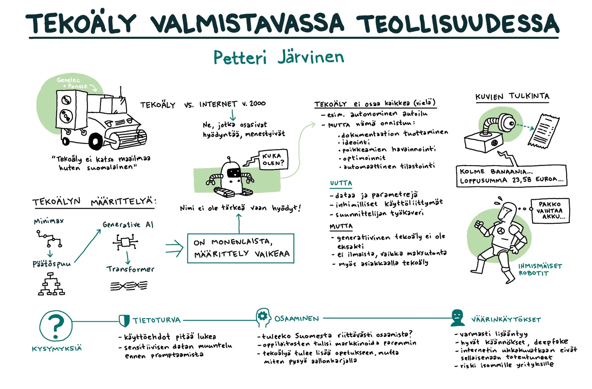 Kuvituksen tyyli on pidetty selkeänä ja informatiivisena, mutta mukana on ripaus meille ominaista rentoutta ja oivaltavuutta. Lopputuloksena syntynyt visuaalinen kooste jaottelee aiheet luontevasti teemoihin: tekoälyn määrittelyyn, osaamiseen, tietoturvaan ja käytännön purkuun. Kuvitus ei ole vain raportti tapahtumasta, vaan se on itsenäinen tietopaketti, joka auttaa katsojaa hahmottamaan teollisen tekoälyn nykytilaa ja tulevaisuutta yhdellä silmäyksellä.