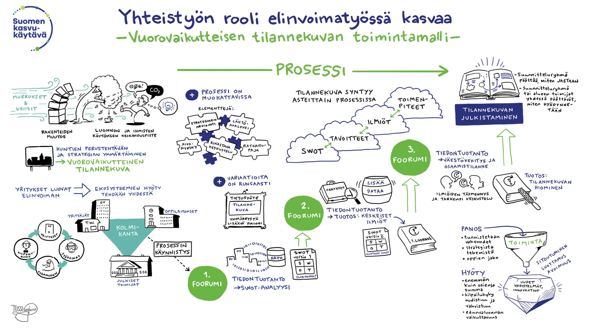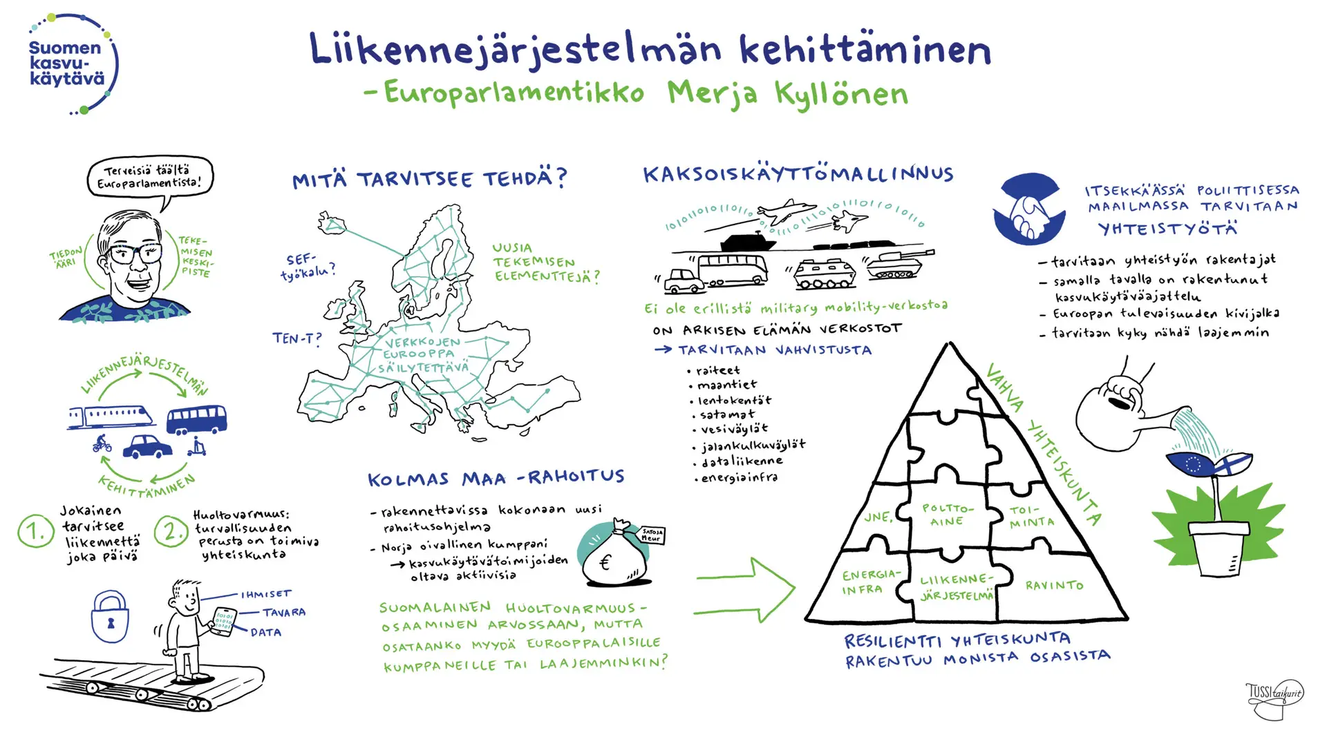 Me Tussitaikureilla vastasimme tähän tarpeeseen tuomalla puheenvuoroihin mukaan visuaalisen viestinnän asiantuntijuutemme. Merja Kyllösen esityksessä visualisoimme liikennejärjestelmän kehittämistä ja yhteiskunnan resilienssiä, kun taas Jaana Villasen puheenvuoro “Yhteistyön rooli elinvoimatyössä kasvaa” sai kuvallisen muodon diversiteetin ja luovuuden kautta. Livekuvitus auttoi jäsentämään asioita.
