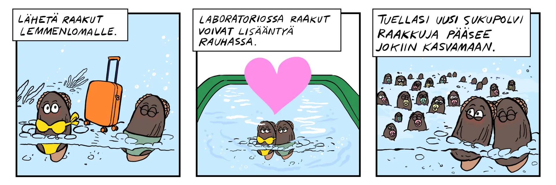 Ratkaisimme haasteen rakentamalla kampanjan Maggie-raakun ympärille. Kuvitusvideo ja siihen pohjautuva sarjakuvamainen kuvitus – kuten pilke silmäkulmassa toteutettu kuvaus raakkujen ”lemmenlomasta” laboratoriossa – ovat loistava esimerkki monimutkaisen asian selkeyttämisestä. Huumori ja tarinallisuus tekevät tieteellisestä tiedosta helpommin lähestyttävää ilman, että asian tärkeys hämärtyy.