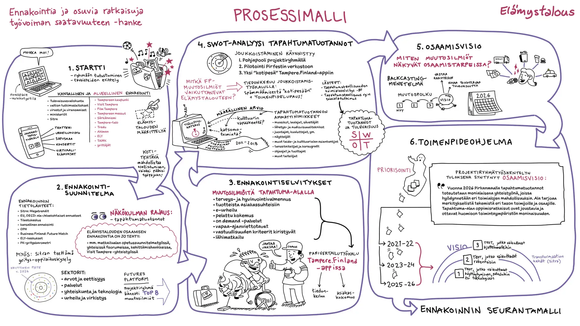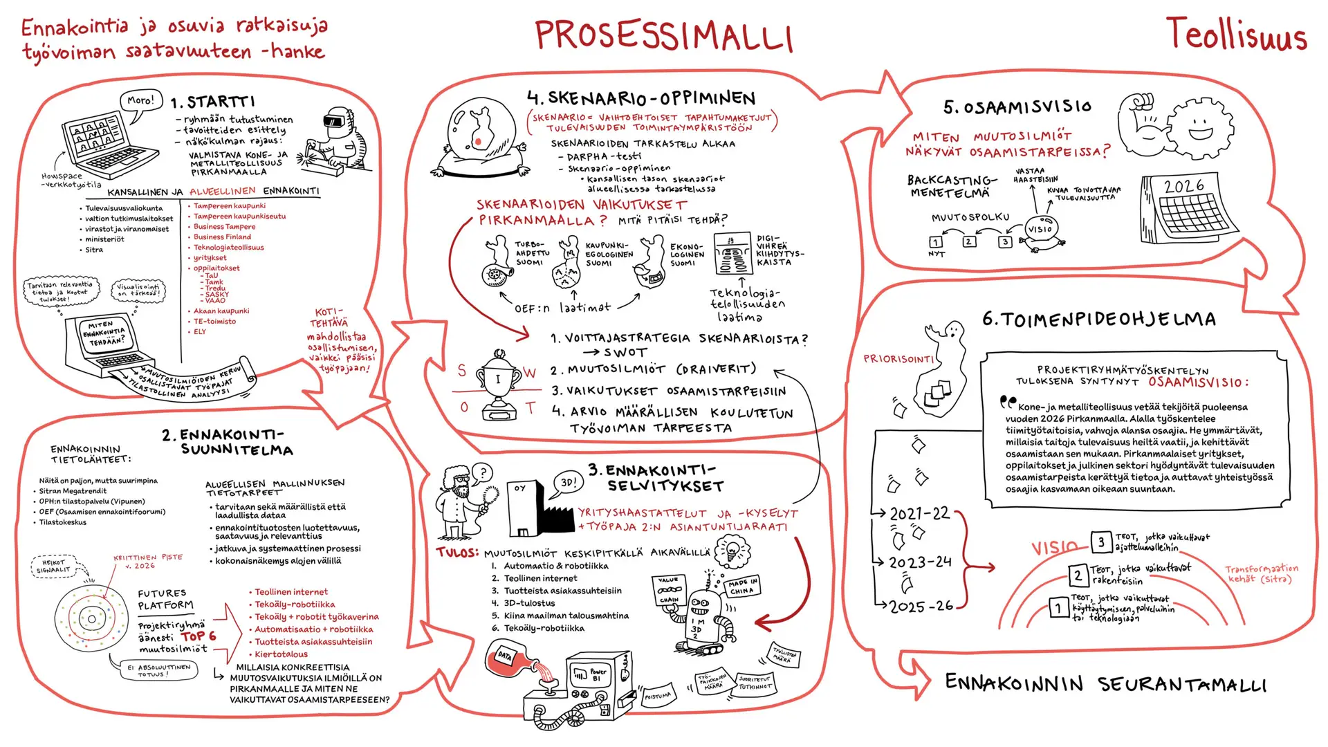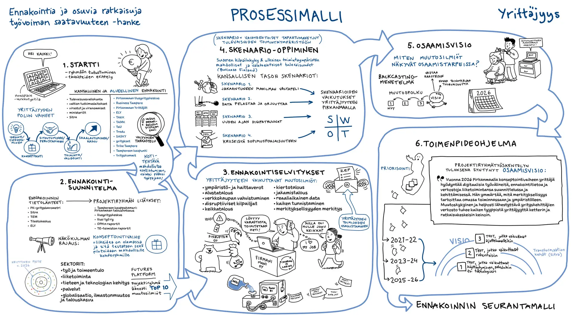 Työvoiman saatavuus on yksi alueiden ja tämän ajan suurimmista ja monitahoisimmista haasteista. Tampereen hallinnoimassa hankkeessa tarve oli kirkastaa valtava määrä ennakointitietoa ja asiantuntijanäkemyksiä muotoon, joka puhuttelee eri toimialojen päättäjiä, oppilaitoksia ja kehittäjiä. Haasteena tällaisissa laajoissa hankkeissa on usein se, miten systeeminen muutos ja monivaiheiset prosessit saadaan viestittyä niin, ettei tärkeä informaatio huku raskaiden tekstiraporttien alle.