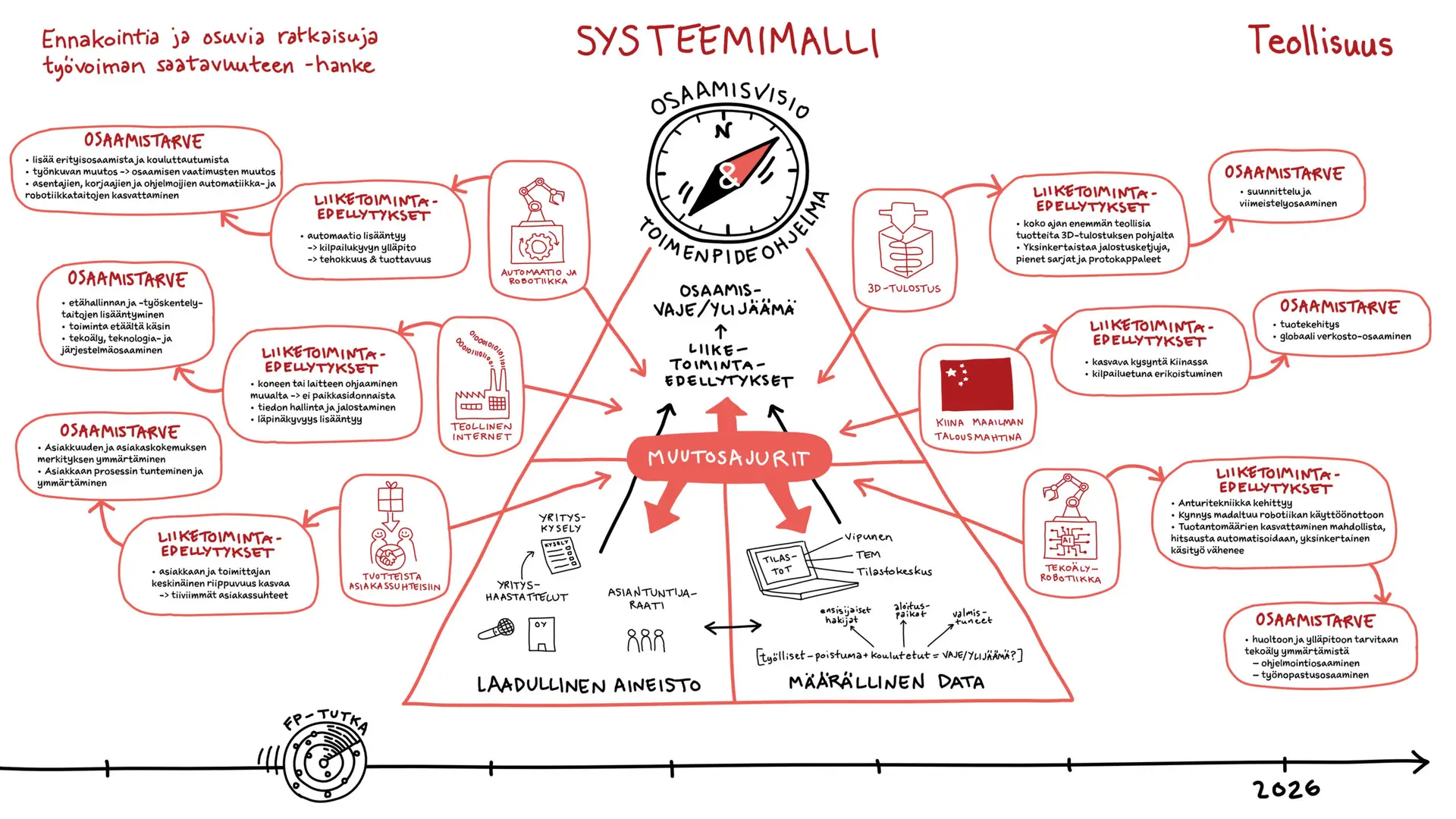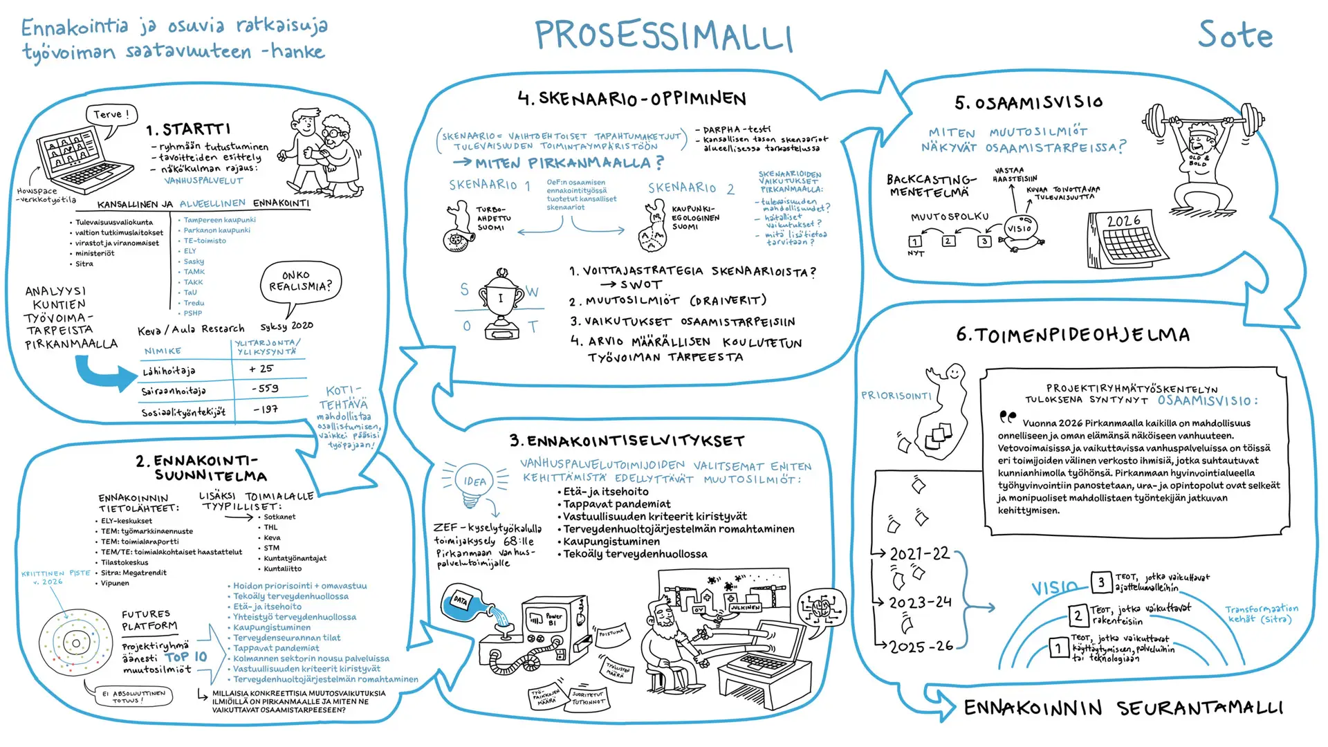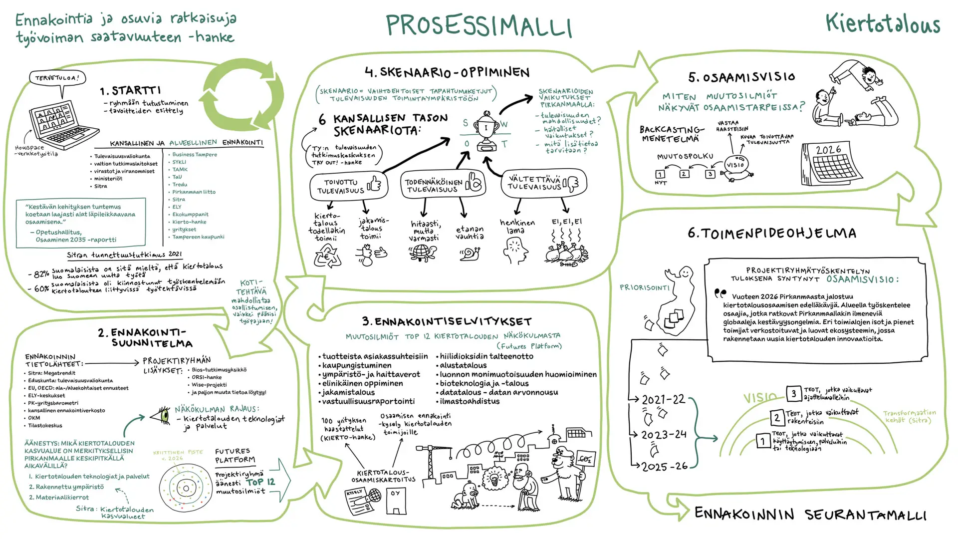 Työvoiman saatavuus on yksi alueiden ja tämän ajan suurimmista ja monitahoisimmista haasteista. Tampereen hallinnoimassa hankkeessa tarve oli kirkastaa valtava määrä ennakointitietoa ja asiantuntijanäkemyksiä muotoon, joka puhuttelee eri toimialojen päättäjiä, oppilaitoksia ja kehittäjiä. Haasteena tällaisissa laajoissa hankkeissa on usein se, miten systeeminen muutos ja monivaiheiset prosessit saadaan viestittyä niin, ettei tärkeä informaatio huku raskaiden tekstiraporttien alle.