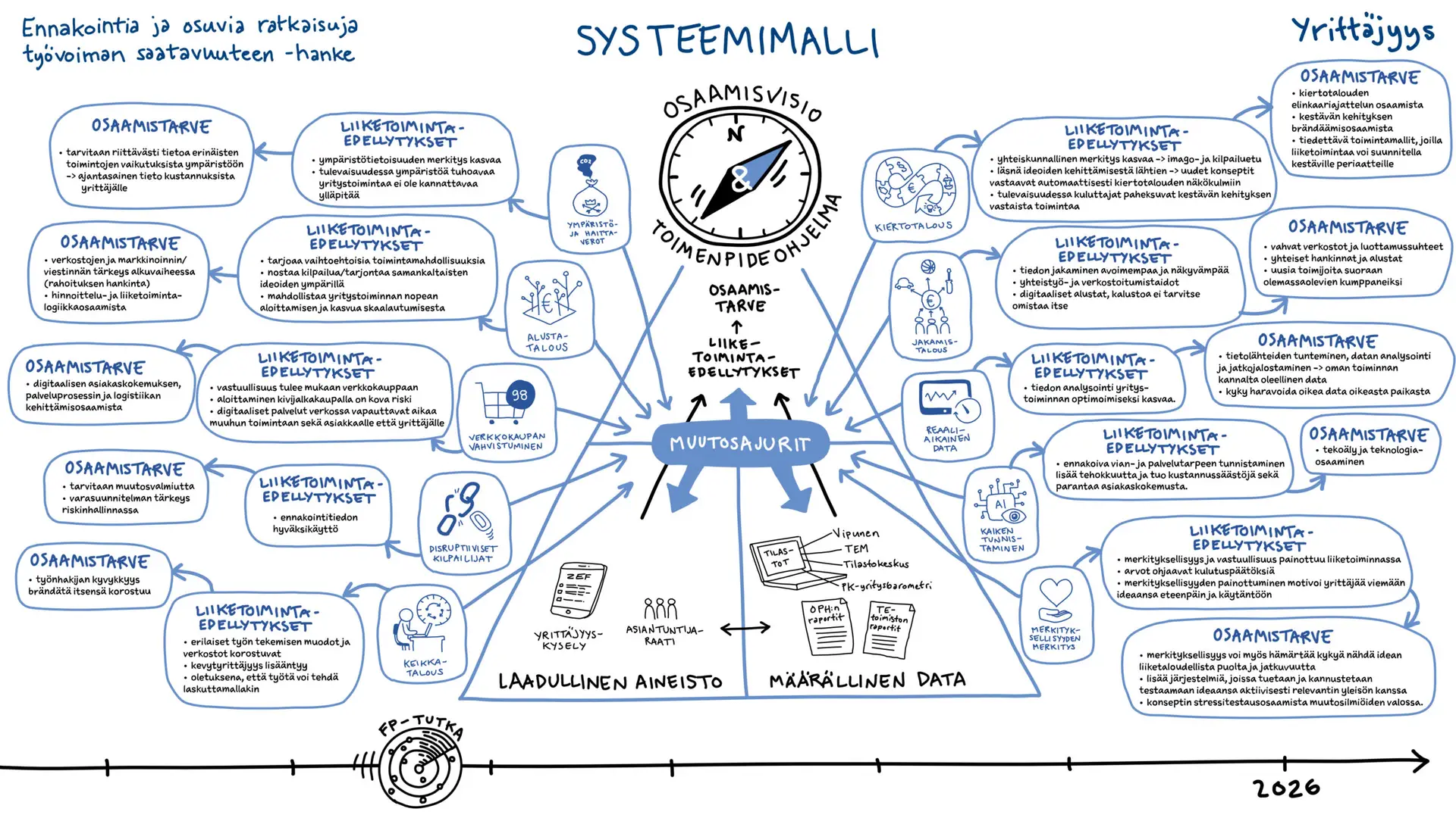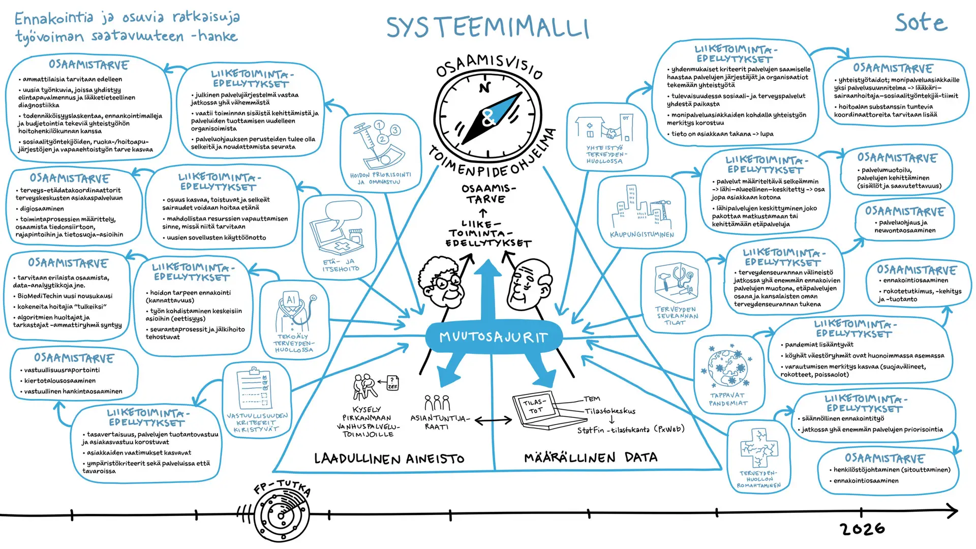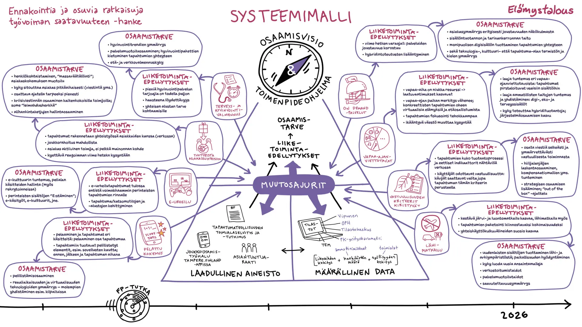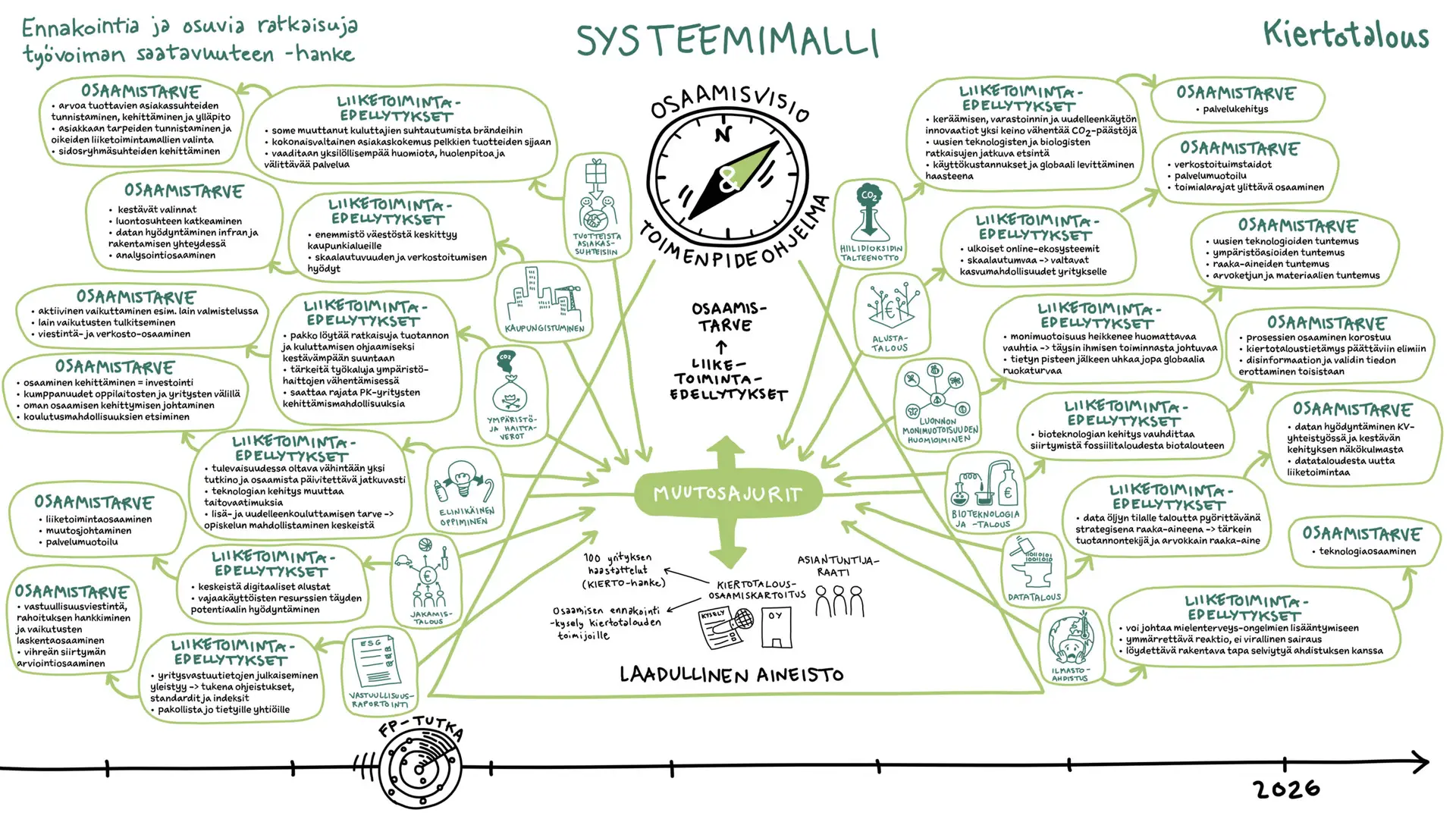 Me Tussitaikureilla tartuimme haasteeseen luomalla jokaiselle kohderyhmälle kaksi erilaista kuvitusta: systeemimallin ja prosessimallin. Visuaalinen viestintä valjastettiin kuvaamaan sekä muutoksen ajureita että käytännön etenemispolkuja. Kuvituksissa käytettiin selkeitä symboleita ja asioiden loogista ryhmittelyä, jolloin vaikeasti hahmotettavat syy-seuraussuhteiden verkostot muuttuivat silmäiltäväksi kokonaisuudeksi. Kuvitus toimi tässä siltana teorian ja käytännön välillä, auttaen katsojaa löytämään olennaisen tiedon nopeasti.