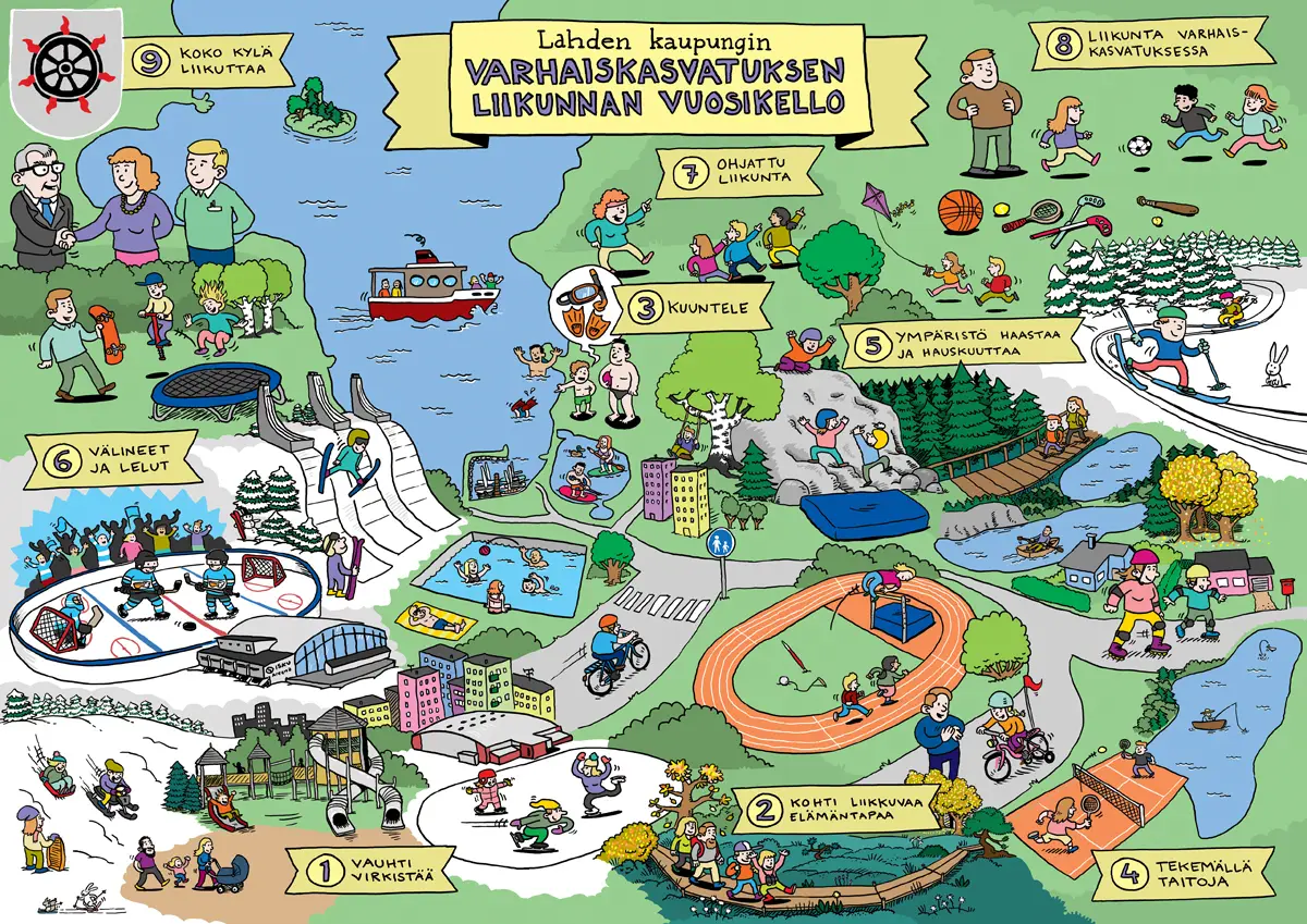 Ratkaisumme oli luoda tarinallinen karttakuvitus, joka sijoittuu tunnistettavaan lahtelaiseen maisemaan. Kuvituksessa näkyvät muun muassa Salpausselän hyppyrimäet, Vesijärvi, urheilustadion sekä kaupungin vaakuna. Sijoitimme yhdeksän eri liikunnan teemaa – kuten ”Vauhti virkistää” ja ”Koko kylä liikuttaa” – osaksi tätä eläväistä ympäristöä, jolloin laajan vuosikellon selkeyttäminen tapahtui visuaalisten tarinoiden ja tuttujen paikkojen kautta.