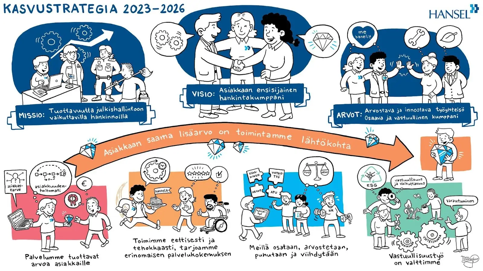 Tussitaikurit toimi Saimaa Groupin kumppanina strategian kiteyttämisessä ja visualisoimisessa piirrosvideoksi ja julisteeksi.